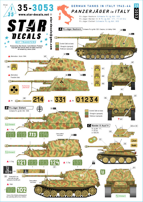 Panzerjäger in Italy. Nashorn, Marder III H and Elefant. s.Pz-Jäger Abt 525, s.Pz-Jäger Abt 653, Pz-Jäger Abt 171.